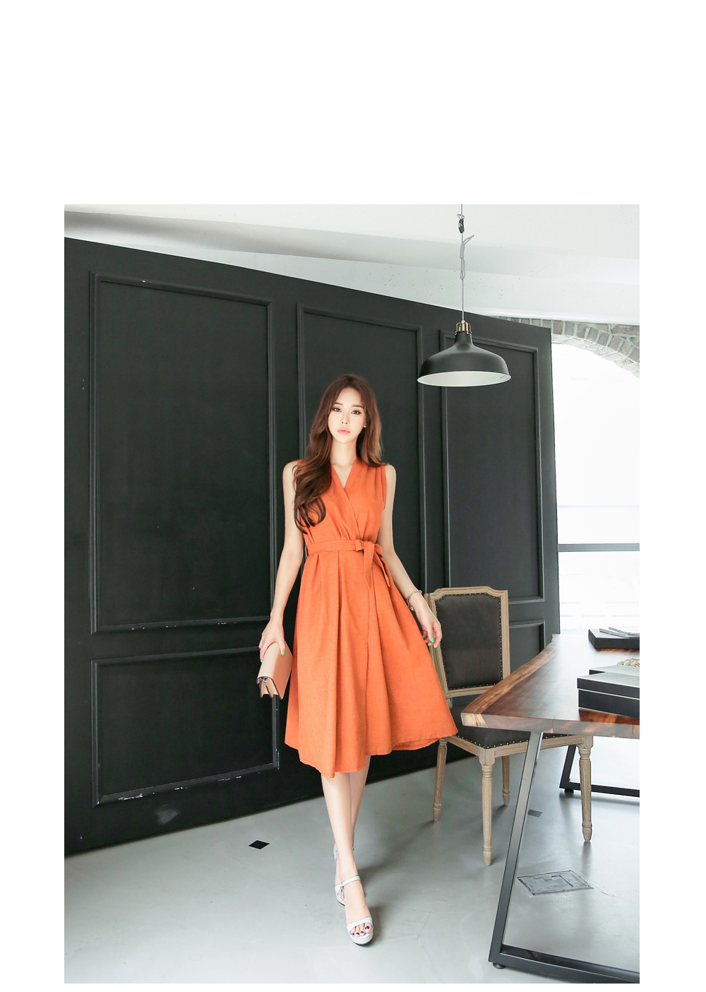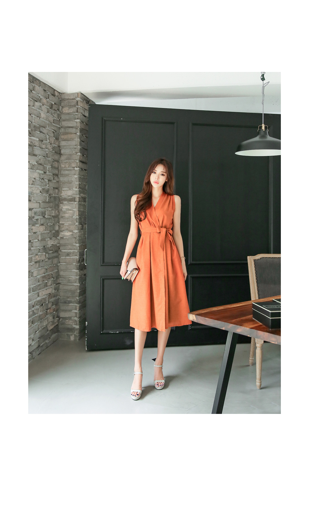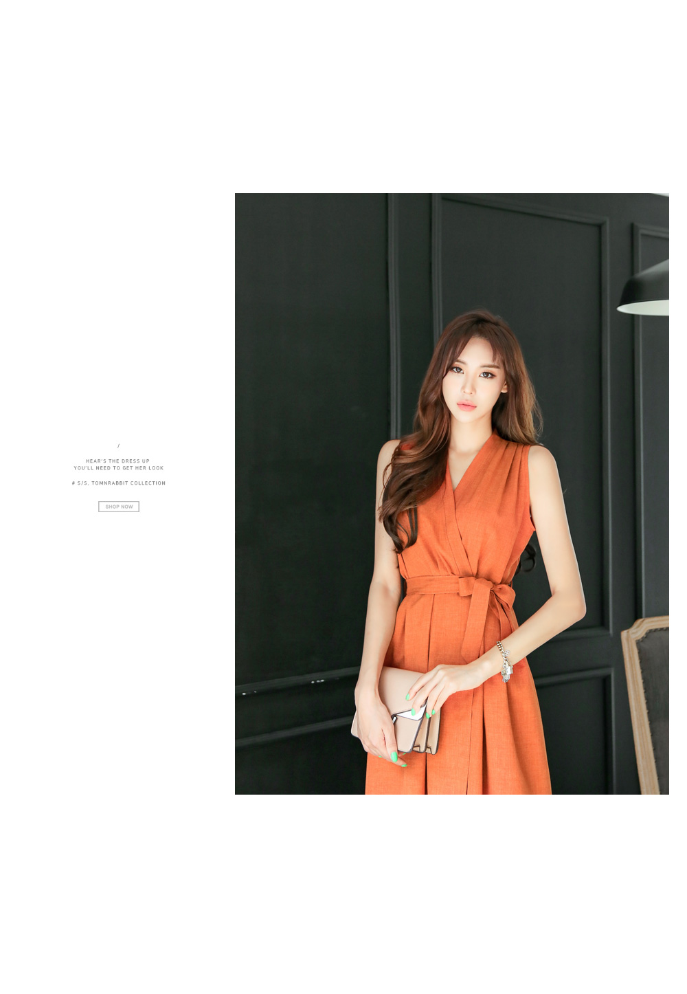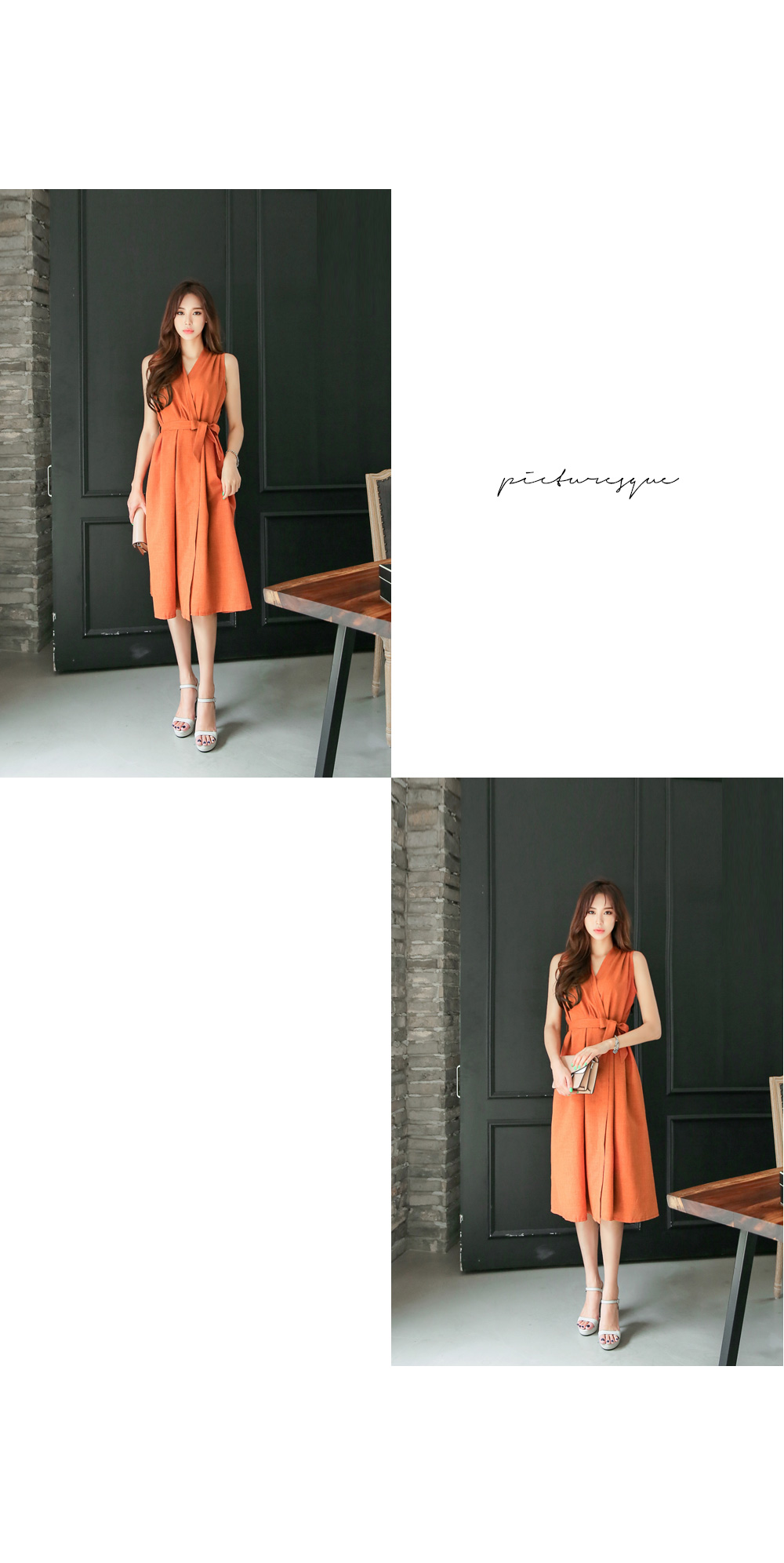 바스트와 허리부분 다트 디테일로 좀더 슬림해 보이는 라인을 완성 시켜 주구요, 허리에 두르는 같은소재의 벨트로 트렌디한 감각도 갖춰주었어요.