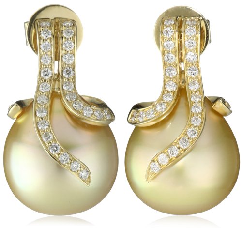12-13mm Natural Color Golden South Sea cultured pearls are hand wrapped in .43ct of diamonds set in 14k yellow gold.