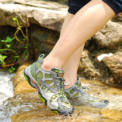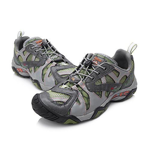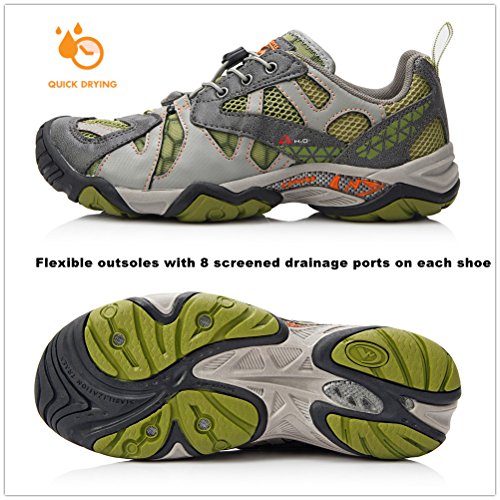 Breathable and comfortable river trekking shoes; fast lacing buckle for quick on and quick off; The combination of EVA midsole, TPU insertion and rubber outsole has excellent traction, skid-proof performance and shock absorption.The drainage holes in the outsole can quickly draw off the water to maintain the shoes dry and cool. Sanitized actifresh insole.