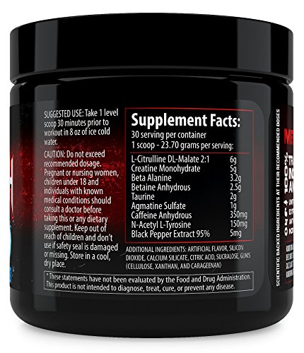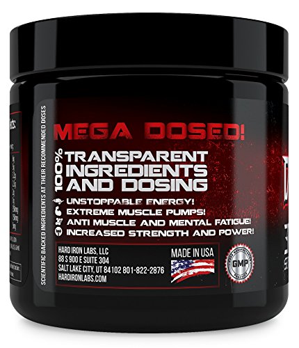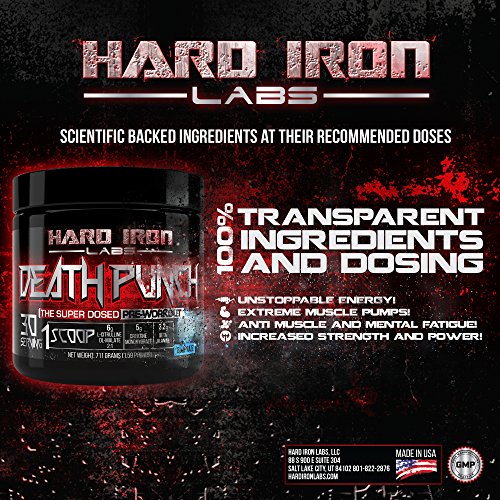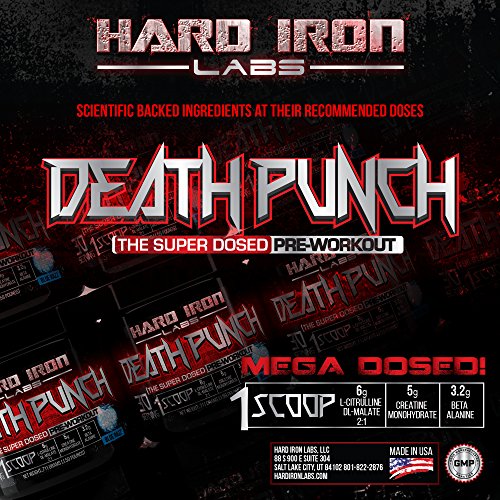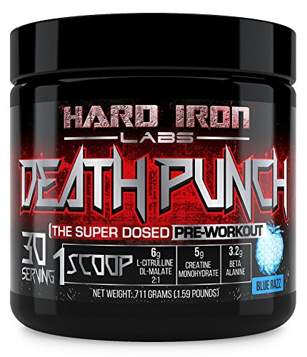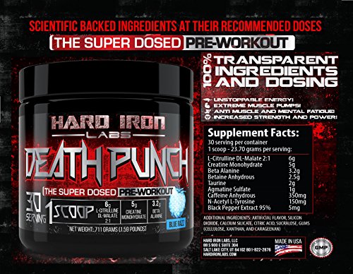 -. Binding : Health and Beauty -. Brand : Hard Iron Labs -. Feature : MEGA DOSED - Almost 3 times more ingredients than most competitors pre-workouts! Most other "high-dosed" pre workouts will only give you 20 servings per container. But we don't cut costs! We give you a full 30 servings per container! / 100% TRANSPARENT INGREDIENTS AND DOSING - Each ingredient is clearly laid out in our supplements facts so you know exactly what you are taking. / EXTREME MUSCLE PUMPS - With 6 grams L-Citrulline DL-Malate 2:1; 2 grams of Taurine; and 1 gram of Agmatine Sulfate. You will experiencing the best pump of your life! / INCREASE STRENGTH AND POWER - This formula is specifically design for serious athletes who want to get the most our of their workouts. You will feel more powerful and stronger DAY ONE! / SCIENTIFIC BACK INGREDIENTS AT THEIR CLINICALLY RECOMMENDED DOSES; NO BS JUST GAINS - Just do some research and you will be blown away with our high dosed scientifically backed formula. When we developed this product we didn't care about the cost; The only thing we care about is developing products the give the best results PERIOD. -. IsAdultProduct : 0 -. Label : Hard Iron Labs -. Manufacturer : Hard Iron Labs -. MPN : HILDeathPunchBlue30Srv -. PackageQuantity : 1 -. PartNumber : HILDeathPunchBlue30Srv -. ProductGroup : Health and Beauty -. ProductTypeName : HEALTH_PERSONAL_CARE -. Publisher : Hard Iron Labs -. Studio : Hard Iron Labs -. Title : Hard Iron Labs - Death Punch - The Super Dosed Pre-Workout! Blue Razz Flavor (30 Servings)