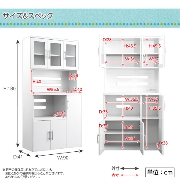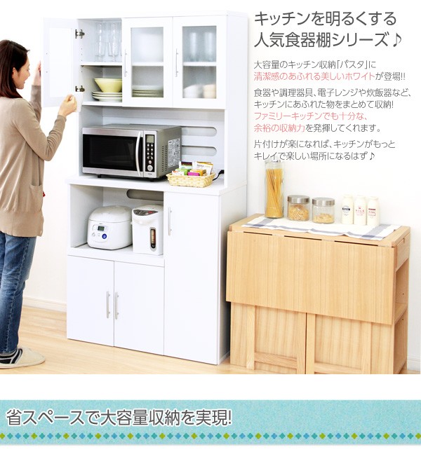 【商品について】ホワイト食器棚【パスタキッチンボード】(幅90cm×高さ180cmタイプ)■サイズ:・本体外寸:幅90x奥行41x高さ180cm ・上棚(左)内寸:幅56x奥行28x高さ45.5cm(可動棚1枚) ・上棚(右)内寸:幅27x奥行28x高さ45.5cm(可動棚1枚) ・中段内寸:幅85.5x奥行40(28)x高さ40cm ・スライドトレー内寸:幅55.5x奥行35(スライド時63.5)x高さ40cm ・下段(左)内寸:幅56x奥行38x高さ45cm(可動棚1枚) ・下段(右)内寸:幅27x奥行38x高さ85.5cm(可動棚1枚)■カラー:ホワイト■素材:構造部分:パーチクルボード、MDF 表面加工:プリント式化粧合板■その他:・梱包サイズ:(2-1):約97x23x36cm (2.9才)(2-2):約97x47x23cm (3.8才)・梱包重量:合計(約)44kg ※メーカー直送品、商品代引き不可