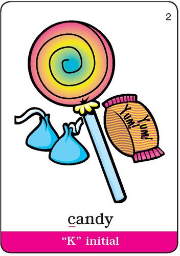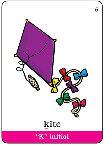 64 illustrated cards (3 1/4" x 4 1/4") - 32 picture-word pairs (i.e. slide, clam, glasses) target "K" sounds