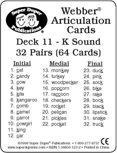 Why do kids love Webber Artic Cards? They have the happiest, most colorful pictures of all artic sets; they come in pairs (for playing LOTS of games); and they are easy to hold (large 3 ¼" x 4 ¼"). "K" Sounds Webber Articulation Cards feature: