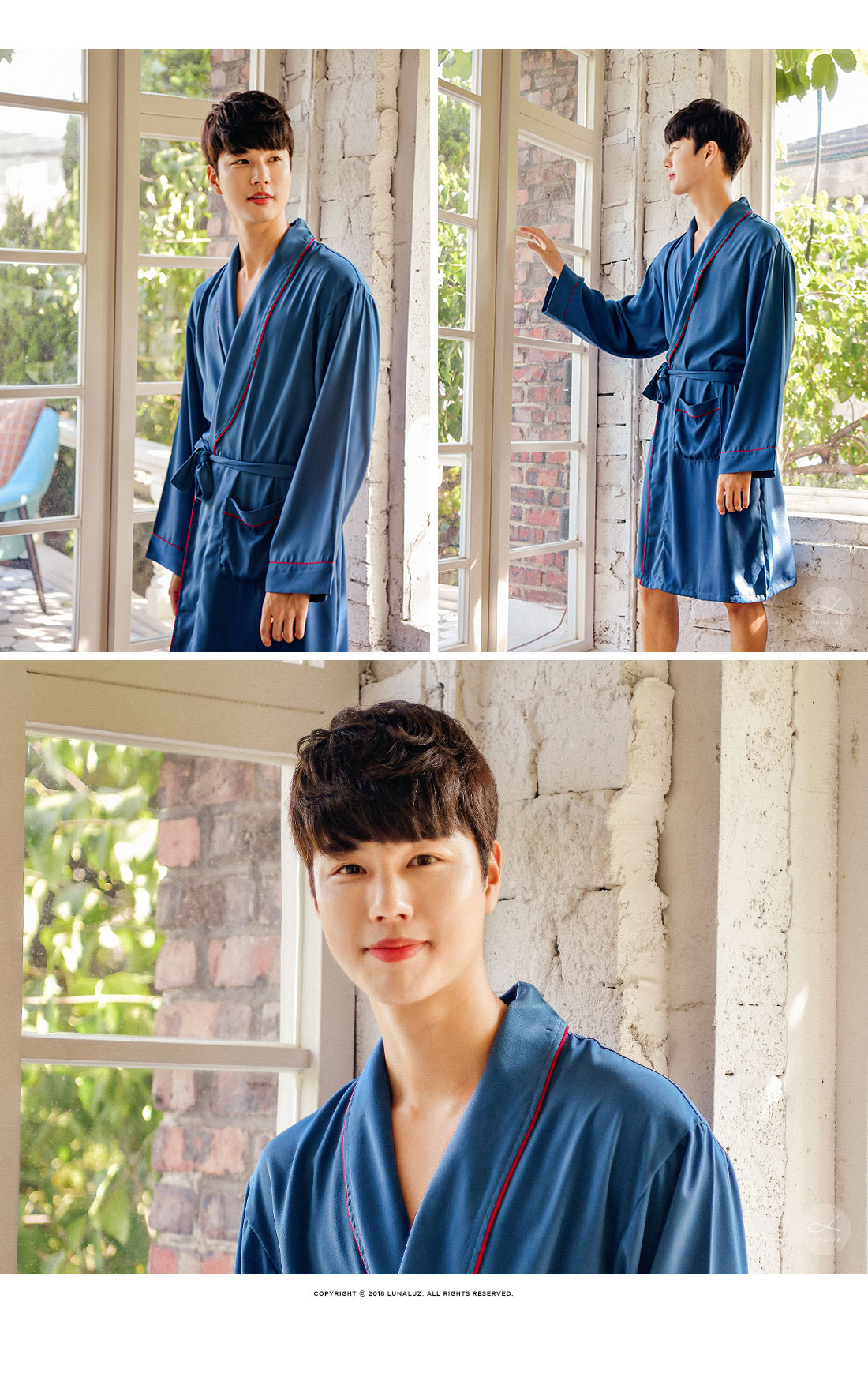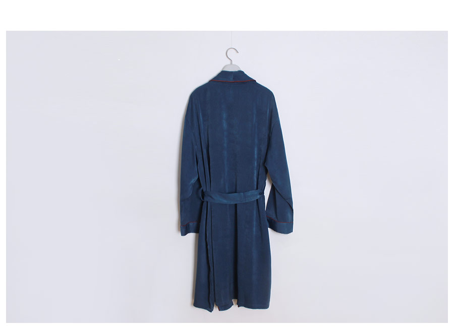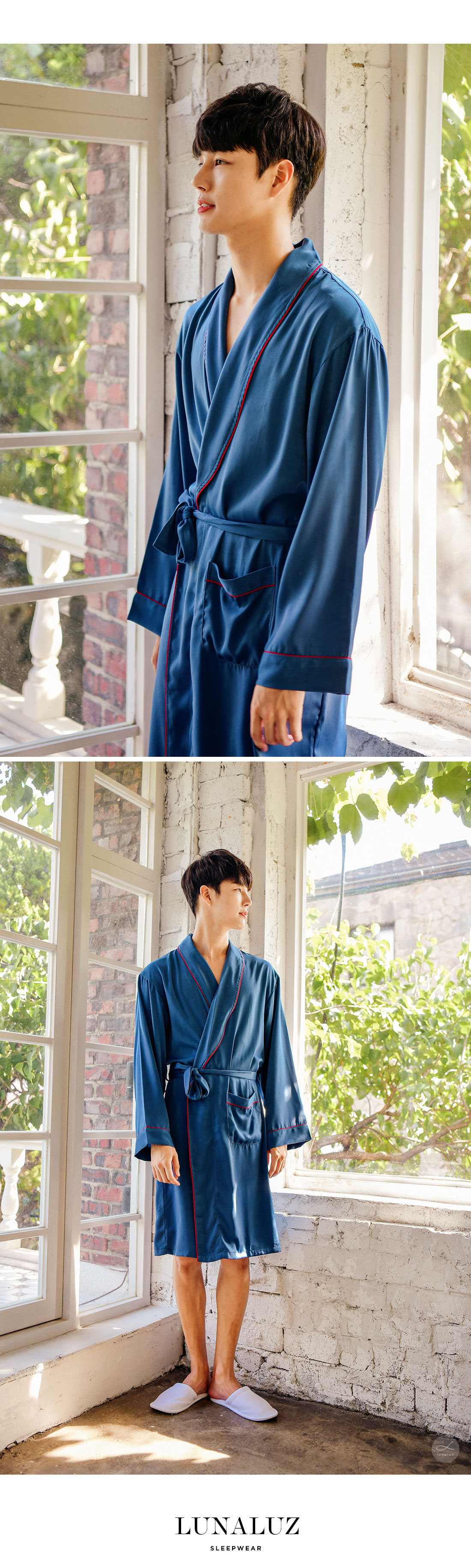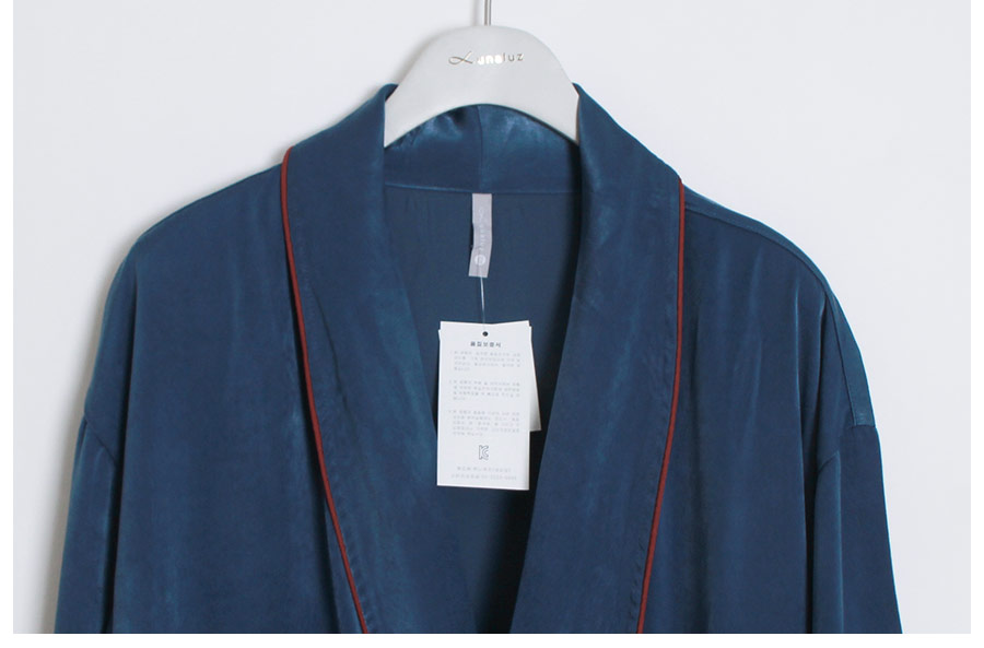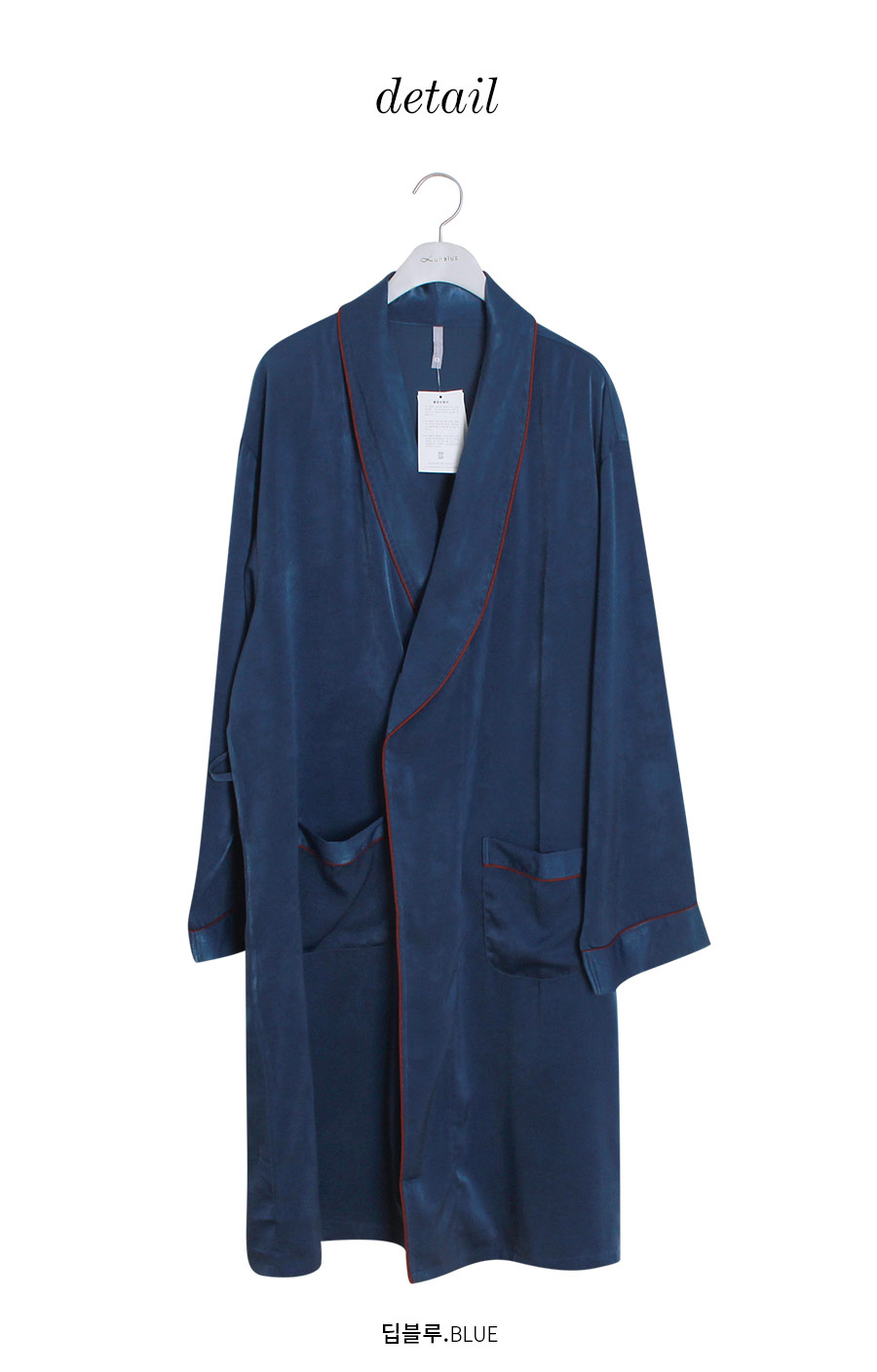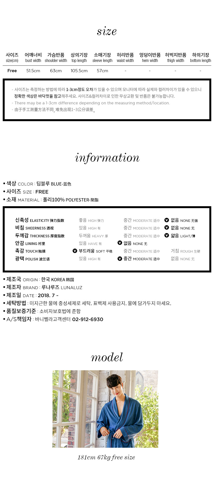 탄탄하고 고급스러운 워싱 샤틴 소재가 매력적인 로브! 빛에 따라 감도는 고급스러운 워싱 표면이 만족도를 더 높여 줄 거에요~! 광택이 도는 소재가 아닌 고급스러운 윤기가 흐르는 네츄럴한 느낌의 원단입니다.. 피부에 닿는 터칭감이 굉장히 좋고, 부드럽게 하늘거리는 소재감이 실루엣을 더 예쁘게 살려줍니다. 매끈하고 흐늘거리는 소재이지만 고급스러운 중량감이 느껴지는 텍스쳐랍니다. 컬러는 고급스러운 딥블루 한 가지로 제작했습니다. DETAIL 깔끔한 로브 스타일로 카라의 끝 부분과 여밈 클로징 부분까지 파이핑으로 포인트를 주어 깔끔하게 마무리 했습니다. 큰 사이즈의 포켓을 양사이드에 봉제해 포인트를 주었습니다. 감각적이고 스타일리쉬하며 질리지 않는 스타일로 매 해 손이 갈 퀄리티 높은 로브입니다. 흐늘거리는 소재인 만큼 까다로운 봉제 작업이 들어갔습니다. 심플한 스타일을 좋아하시는 고객님들께 적극 추천해드립니다. 100% 국내 제작으로 봉제선이 깔끔하고, 디자인과 소재의 퀄리티가 높습니다. SIZE 100size~110size 까지 커버 가능한 free 사이즈 입니다.