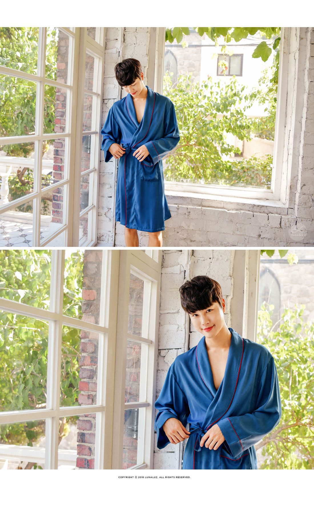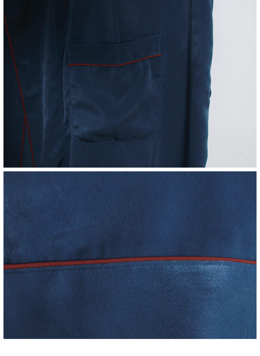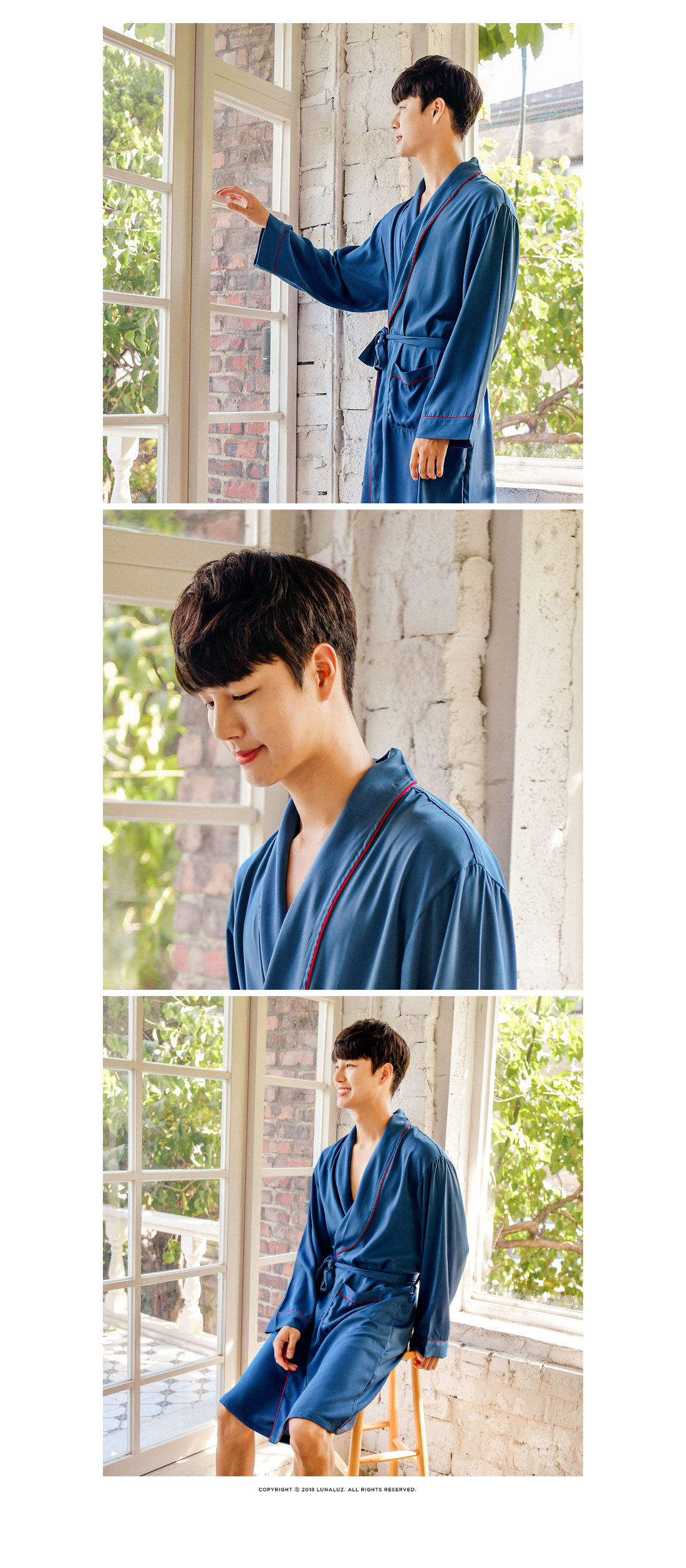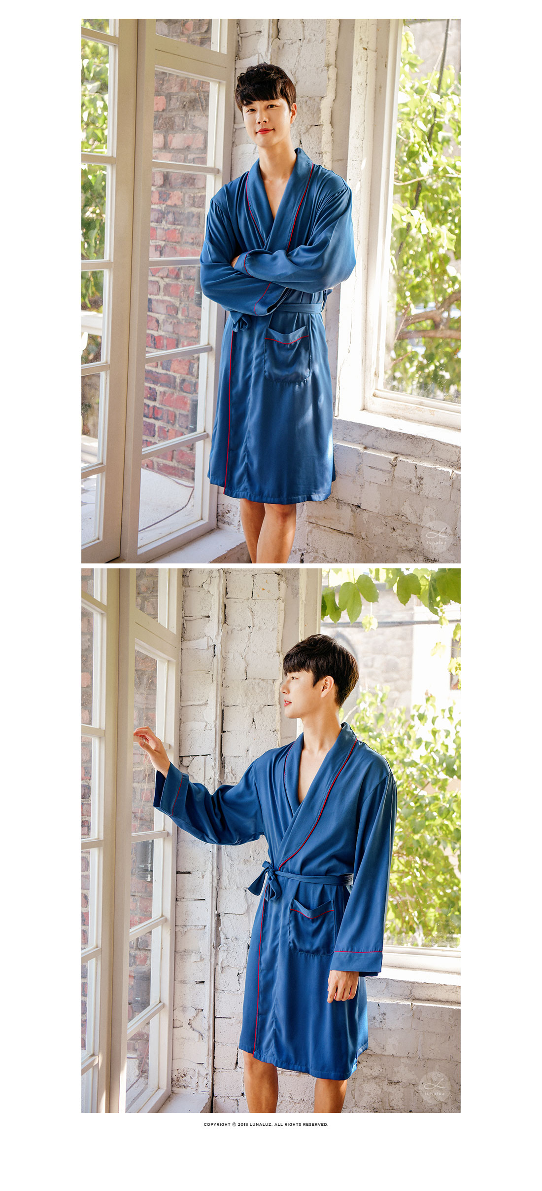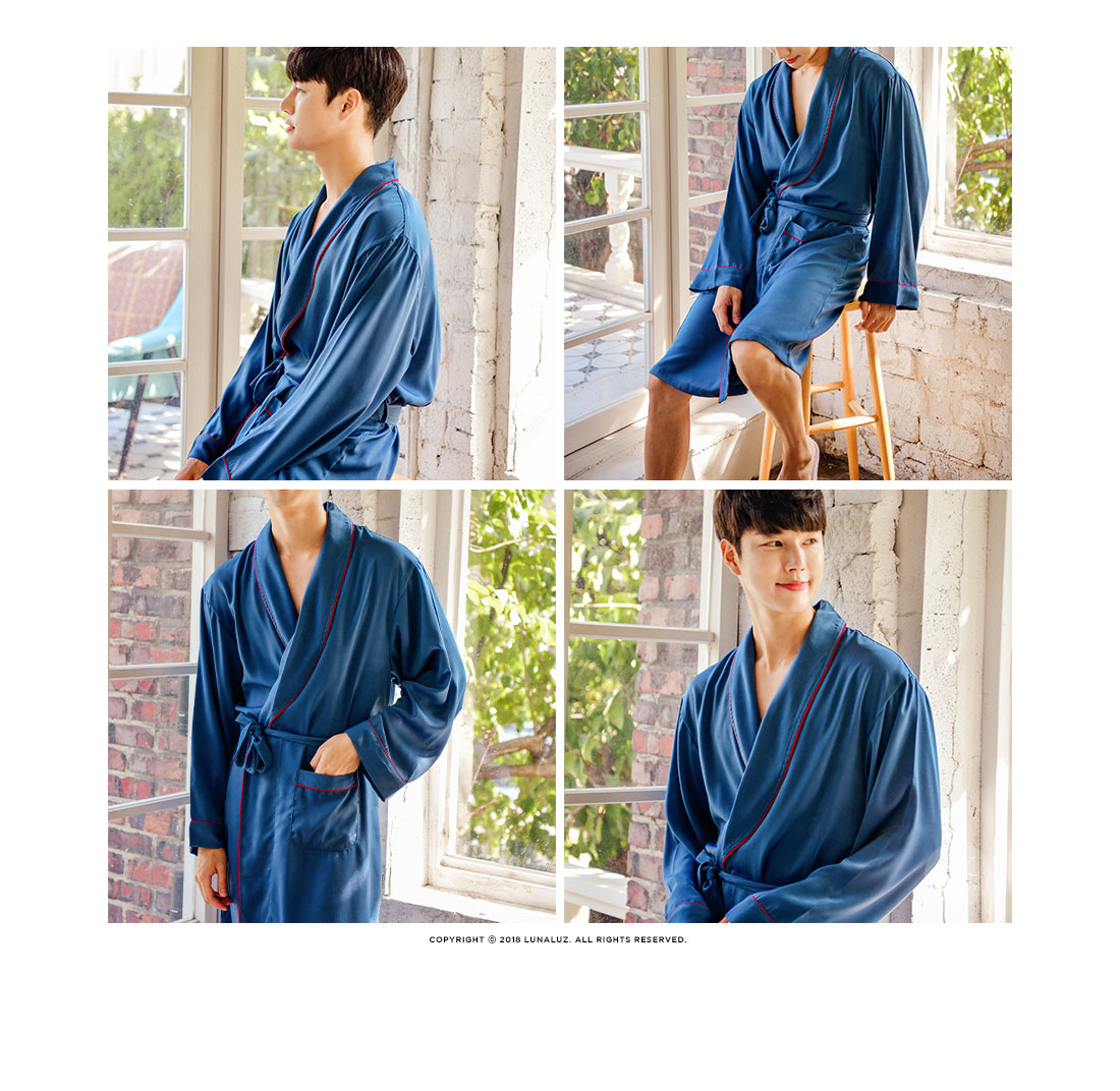 탄탄하고 고급스러운 워싱 샤틴 소재가 매력적인 로브! 빛에 따라 감도는 고급스러운 워싱 표면이 만족도를 더 높여 줄 거에요~! 광택이 도는 소재가 아닌 고급스러운 윤기가 흐르는 네츄럴한 느낌의 원단입니다.. 피부에 닿는 터칭감이 굉장히 좋고, 부드럽게 하늘거리는 소재감이 실루엣을 더 예쁘게 살려줍니다. 매끈하고 흐늘거리는 소재이지만 고급스러운 중량감이 느껴지는 텍스쳐랍니다. 컬러는 고급스러운 딥블루 한 가지로 제작했습니다. DETAIL 깔끔한 로브 스타일로 카라의 끝 부분과 여밈 클로징 부분까지 파이핑으로 포인트를 주어 깔끔하게 마무리 했습니다. 큰 사이즈의 포켓을 양사이드에 봉제해 포인트를 주었습니다. 감각적이고 스타일리쉬하며 질리지 않는 스타일로 매 해 손이 갈 퀄리티 높은 로브입니다. 흐늘거리는 소재인 만큼 까다로운 봉제 작업이 들어갔습니다. 심플한 스타일을 좋아하시는 고객님들께 적극 추천해드립니다. 100% 국내 제작으로 봉제선이 깔끔하고, 디자인과 소재의 퀄리티가 높습니다. SIZE 100size~110size 까지 커버 가능한 free 사이즈 입니다.