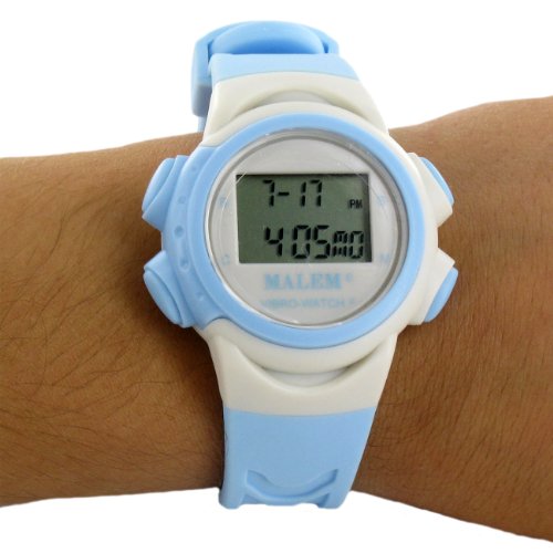 -. Binding : Health and Beauty -. Brand : Malem -. Color : White/Light Blue -. Department : unisex-child -. EAN : 5060049630328 -. Feature : A discreet vibrating reminder that you won't tune out / Set up to 12 independent alarms to go off each day or use the countdown timer for an interval reminder / Great for timed voiding, medication reminders or for any event you don't want to miss! / Backed by a 1 year warranty -. Label : Malem -. Manufacturer : Malem -. MPN : M1LB -. PackageQuantity : 610 -. PartNumber : M1LB -. ProductGroup : Health and Beauty -. ProductTypeName : HEALTH_PERSONAL_CARE -. Publisher : Malem -. Studio : Malem -. Title : Malem Vibro-Watch 12 Alarm Vibrating Watch - White/Light Blue