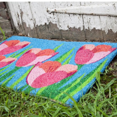 -. Feature : Made from all-natural coconut fiber which is an excellent dirt-trapper; 3/4'' thickness / This mat is hand stenciled with permanent fade-resistant dyes / 18 in. x 30 in.