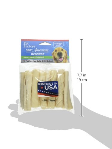 -. Binding : Misc. -. Brand : Pet Factory -. EAN : 0094983741623 -. Feature : MADE IN THE USA / 100% American Beefhide / Improves dental health by helping to scrape away plaque, control tartar build-up and maintain gum health. -. Label : PET FACTORY -. Manufacturer : PET FACTORY -. Model : 949020 -. MPN : 949020 -. NumberOfItems : 1 -. PackageQuantity : 1 -. PartNumber : 949020 -. ProductGroup : Pet Products -. ProductTypeName : PET_SUPPLIES -. Publisher : PET FACTORY -. ReleaseDate : 2013-08-14 -. Size : 15 Pack -. Studio : PET FACTORY -. Title : Pet Factory 74162 3-3 1/2" Beefhide Mini Rolls. Made in USA -. UPC : 094983741623