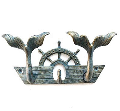 Cast Iron Tails of Mermaid Hook with Ship Wheel Blue with Bronze Finish 8" x 5"