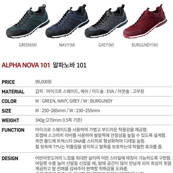 마이크로 스웨이드를 사용하여 가볍고 부드러운 착용감을 제공함.토캡에 스트러치 러버를 사용하여 발앞쪽에 안정성을 높일 수 있도록 설계함.측면 몰드에 트렉스타 DNA를 스티치로 형상화하여 디테일을 높힘.힐 뒷측에 TPU는 뒤틀림을 방지하고 발목을 보호하는데 탁월한 효과를 줌.