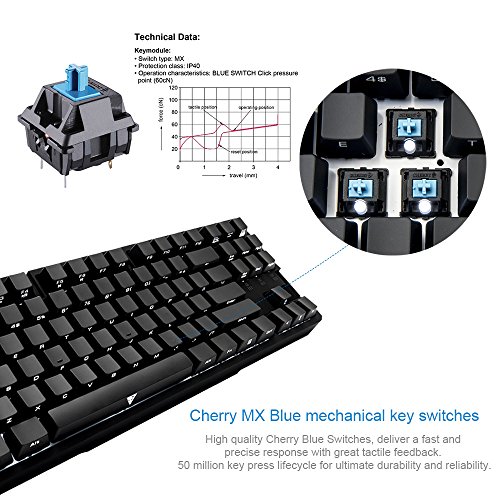 -. Feature : Mechanical Cherry MX Switches with a lifespan of over 50 million keypresses. / 87 key compact and ergonomic design, provides extra space for your mouse. / 6-key or N-key rollover, meet different game requirments, deliver an incredible advantage for gamers. / Detachable braided USB cable with 3 cable routing, portable and provides extra flexibility for your keyboard positioning. / Font printed covert keycaps, provides an clean and stylish look.