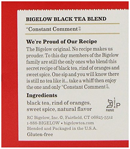 -. Binding : Grocery -. Brand : Bigelow Tea -. EAN : 0072310001053 -. Feature : Pack of six 20-count boxes of calorie-free tea (120 total tea bags) / Hand-picked black tea flavored with orange rinds and sweet spice / Gluten free, with no calories and no carbohydrates; Kosher Parve / An excellent source of healthy antioxidants / Ships in Certified Frustration-Free Packaging -. IsAdultProduct : 0 -. Label : Bigelow -. LegalDisclaimer : Actual product packaging and materials may contain more and different information than what is shown on our website. We recommend that you do not rely solely on the information presented and that you always read labels, warnings, and directions before using or consuming a product. -. Manufacturer : Bigelow -. Model : 7231000105 -. MPN : 0190314 -. NumberOfItems : 6 -. PackageQuantity : 6 -. PartNumber : 0190314 -. ProductGroup : Grocery -. ProductTypeName : GROCERY -. Publisher : Bigelow -. ReleaseDate : 2006-06-22 -. Size : 6 Pack / 20 Bags -. Studio : Bigelow -. Title : Bigelow Constant Comment Tea, 20-Count Boxes (Pack of 6) -. UPC : 072310001053