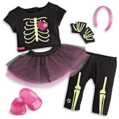 -. Feature : This spooky-chic outfit includes caP.R.I-length leggings, fingerless gloves, and a tee—all with glow-in-the-dark skeleton graphics on the front, plus a glittery pink heart in the ribcage on the shirt. The set comes with a shimmery three-layer tulle skirt, plus a headband and glittery shoes.