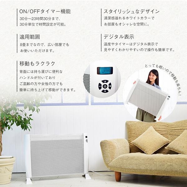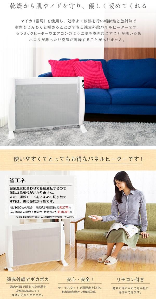 | マイカ(雲母)を使用し、効率よく放熱を行い輻射熱と放射熱で室内をじんわりと暖めることができます。セラミックヒーターやエアコンのように風を巻き起こすことが無いためホコリが舞ったり空気が乾燥することがありません。ON/OFFタイマーや、持ち運びに便利なハンドルが付いているのでとっても便利です。 |