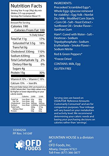 Mountain House Scrambled Eggs with Ham, Red Green Peppers What’s better than a hearty breakfast of real scrambled eggs, ham red and green peppers? One that is a cinch to cook! This is the perfect backpacking breakfast. Super easy to prepare wherever your adventure takes you. Simply add hot water to the pouch and in about 8-10 minutes you’ll have a delicious meal you can eat anywhere! No longer do you need to spend time cleaning pots and pans after a meal. Who is Mountain House? For nearly 50 years, Mountain House adventure meals have consistently been the premier choice of campers, backpackers, and survival experts. Born out of freeze dried meals we make for the United States Special Forces, Mountain House food has a proven history of reliability and most importantly, delicious flavor. With just-add-water preparation and no-mess cleanup, Mountain House is not only the perfect camping or backpacking food, but also for keeping on hand just in case of an emergency. Additionally Mountain House meals have incredible shelf life. With the longest proven shelf life in the industry and a guarantee to taste virtually indistinguishable from new for 12 years in pouches and 25 years in cans, Mountain House is the perfect emergency preparedness or survival food to keep on hand. From the bottom of the deepest ocean, to the tops of the tallest mountains, to the battlefield and back, Mountain House is the food people trust when failure is not an option. Consistently chosen as the best tasting food among outdoor and survival brands, Mountain House is the best camping, backpacking and survival food money can buy. Mountain House Meals are Perfect for: - Emergency Preparedness