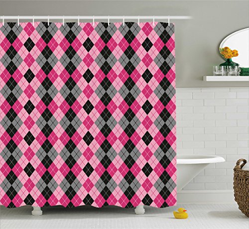 Abstract Shower Curtain by Ambesonne, Argyle Motif with Diamonds and Lozenges Infinite Symmetric Stripes Image, Fabric Bathroom Decor Set with Hooks, 70 Inches, Baby Pink Black Grey