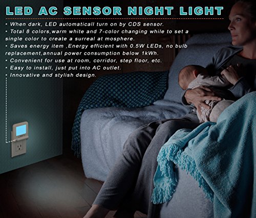 - WARM WHITE: soft night light plug-in with 8 changeable colors