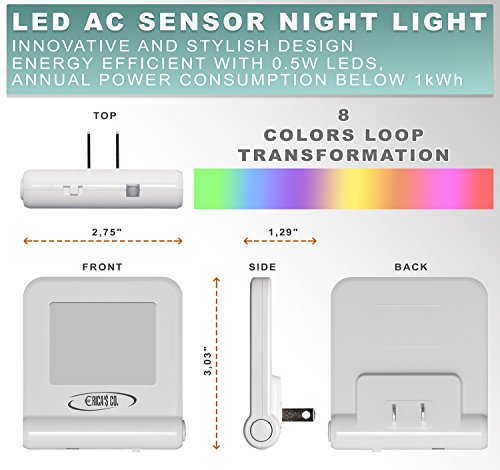 Ericasco Night Light Plug In Warm White LED, Dusk To Dawn Sensor, 8 color night lamp, Soft, smart Energy Efficient Nightlight for Bedroom, Bathroom, Baby Room Stairs, Kitchen, Hallway, Compact 2 Pack