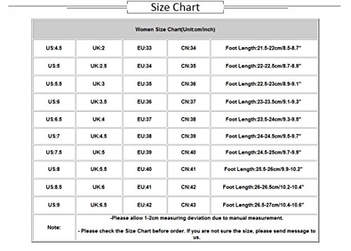 Women Size Chart(Unit:cm/inch) US:4.5----UK:2----EU:33----CN:34----Foot Length:21.5-22cm/8.5-8.7" US:5----UK:2.5----EU:34----CN:35----Foot Length:22-22.5cm/8.7-8.9" US:5.5----UK:3----EU:35----CN:36----Foot Length:22.5-23cm/8.9-9.1" US:6----UK:3.5----EU:36----CN:37----Foot Length:23-23.5cm/9.1-9.3" US:6.5----UK:4----EU:37----CN:38----Foot Length:23.5-24cm/9.3-9.5" US:7----UK:4.5----EU:38----CN:39----Foot Length:24-24.5cm/9.5-9.7" US:7.5----UK:5----EU:39----CN:40----Foot Length:24.5-25cm/9.7-9.9" US:8----UK:5.5----EU:40----CN:41----Foot Length:25.5-26cm/9.9-10.2" US:8.5----UK:6----EU:41----CN:42----Foot Length:26-26.5cm/10.2-10.4" US:9----UK:6.5----EU:42----CN:43----Foot Length:26.5-27cm/10.4-10.6" 0
