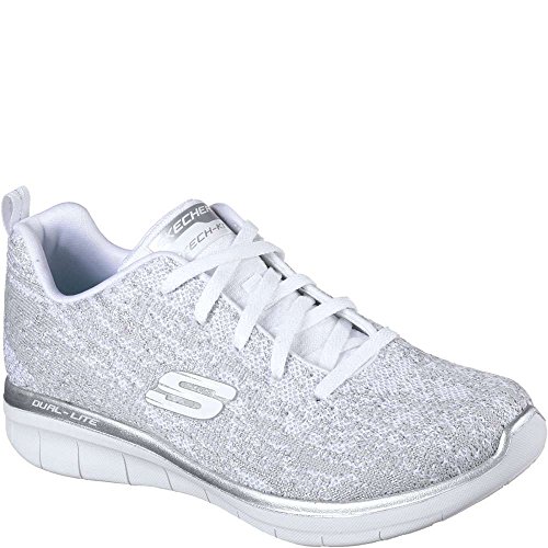 Binding : Apparel Product Description SKECHERS Women's Synergy 2_0 All That Glitters cross-trainer walking shoes feature a nearly one piece soft athletic knit fabric upper. Lace-up front for a secure fit. Padded collar and tongue. Soft mesh fabric shoe lining. Air Cooled Memory Foam cushioned comfort insole. Shock absorbing Dual Lite supportive lightweight midsole. Flexible rubber traction outsole design with multi direction flexibility. 1 inch built in heel. 0