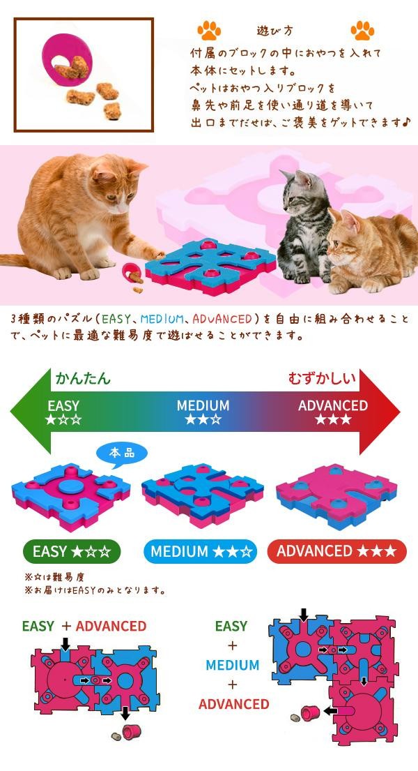 | 隠されたご褒美を夢中で探すパズルゲームで、ペットが楽しく遊びながら学習できます。付属のブロックの中にセットされたおやつを、鼻先や前足を使って出口まで導けばご褒美ゲット!!食べ終わったらほめてあげて下さい♪ |