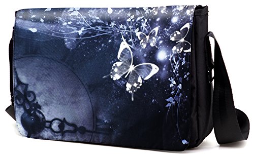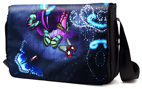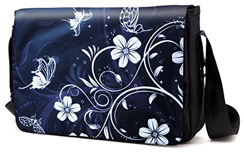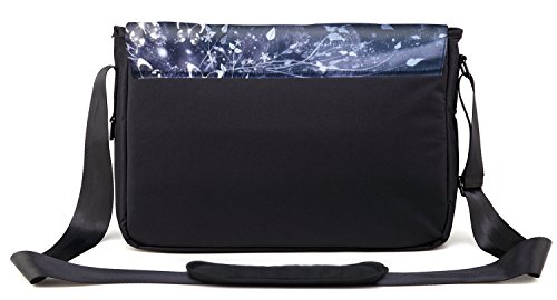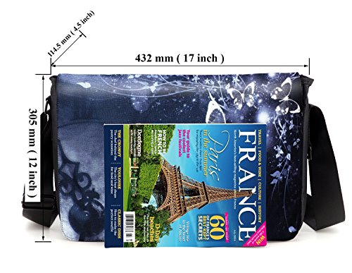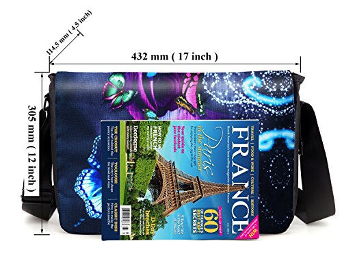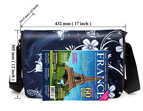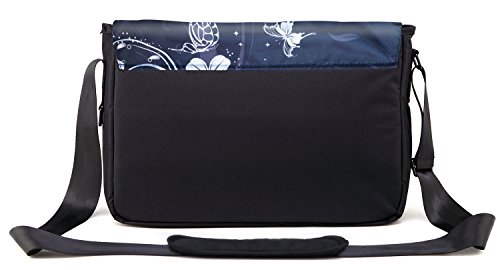 -. Feature : Unique, cool sleek artwork design on premium quality rain proof polyester material / Main padded computer compartment with velcro flap & Padded document, textbook compartment / 2 zipper pockets: 7"H x 10.5"W and 5" x 10.5" with many accessories pockets and pen holders / Soft, wide adjustable shoulder strap with shoulder pad / Overall dimension: Approx. 17"W x 12"H x 4.5" D