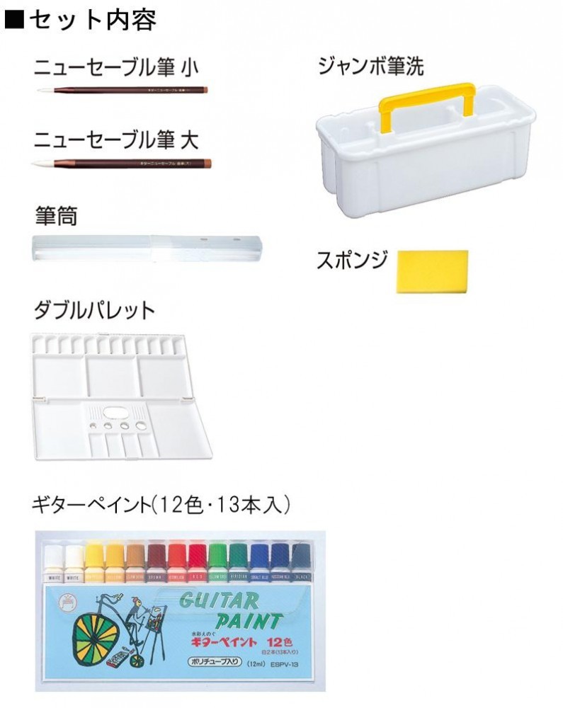 | セット内容 | 水彩絵の具:ギターペイント12色セット(しろ2本・レモンいろ・きいろ・おうどいろ・ちゃいろ・しゅいろ・あか・きみどり・ビリジアン・あお・あいいろ・くろ/各12ml) 画筆:ニューセーブル筆2本(大・小) 筆筒 ジャンボ筆洗 ダブルパレット スポンジ 布製バッグ |