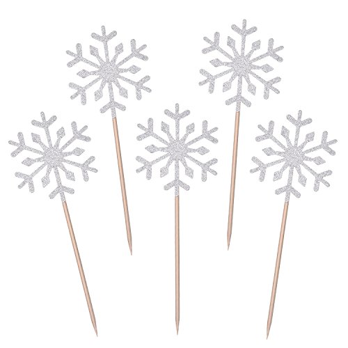 Package includes: 60 counts snowflake cupcake toppers; Color: glitter silver and white; Size: 5.28 inch tall and 1.97 inch wide
