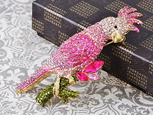 Colorful animated cockatoo bird is perched upon a branch. Mostly pink and aurora borealis Swarovski crystal rhinestones are used to ensure brilliant shine and radiance. A timeless gift for that someone special.