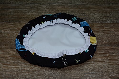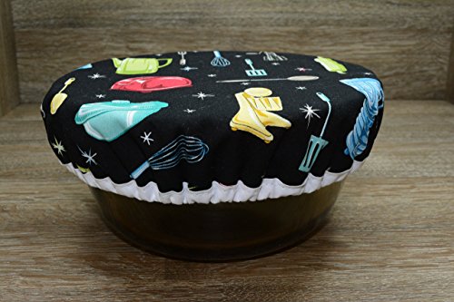 Product Description Are you trying to be more eco-friendly? Our reusable bowl covers are just the thing for you. No more aluminum foil or plastic wrap. Great for potlucks and backyard bbq's to keep the bugs away! Our medium bowl cover fits Kitchen-Aid mixer bowls, keeping your bowl dust free or allowing your dough to rise. Made with one layer of designer cotton and one layer of food safe and waterproof PUL fabric. Finished with elastic and coordinating bias tape. Set of three bowl covers includes: One small bowl cover - fits up to 7" diameter bowl One medium bowl cover - fits up to 9.5" diameter bowl One large bowl cover - fits up to 11" diameter bowl Bowl covers can be wiped clean, or machine washed and dried on delicate cycle. Bowl covers are not for use in the microwave or oven. 0