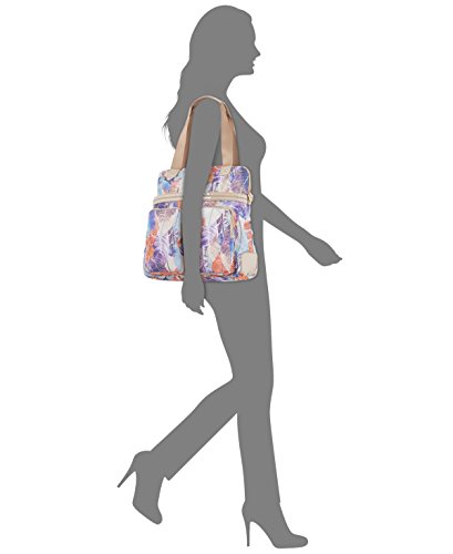 -. Feature : Printed polyester with vegan leather trim; Imported / Handle drop: 10" / Adjustable, removable shoulder strap; dual carry handles / Laptop protection compartment / Inside: two slip pockets, pen loop
