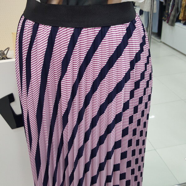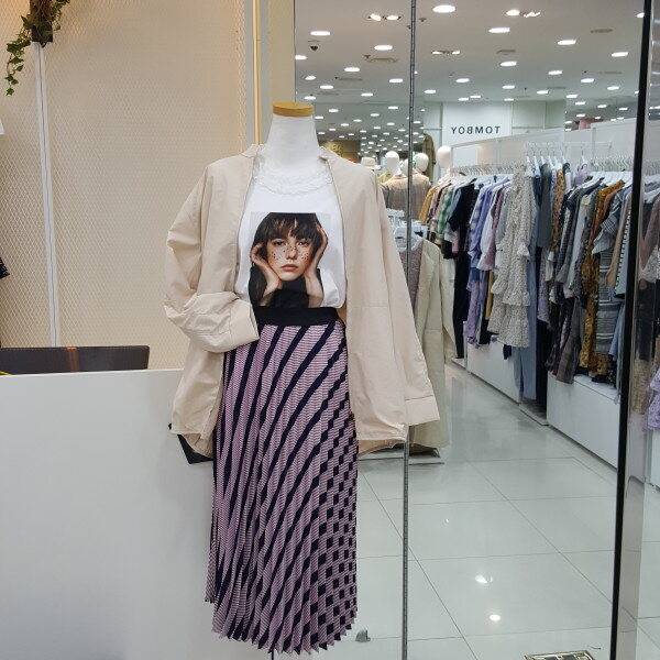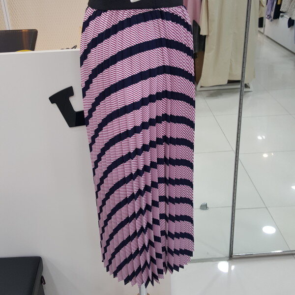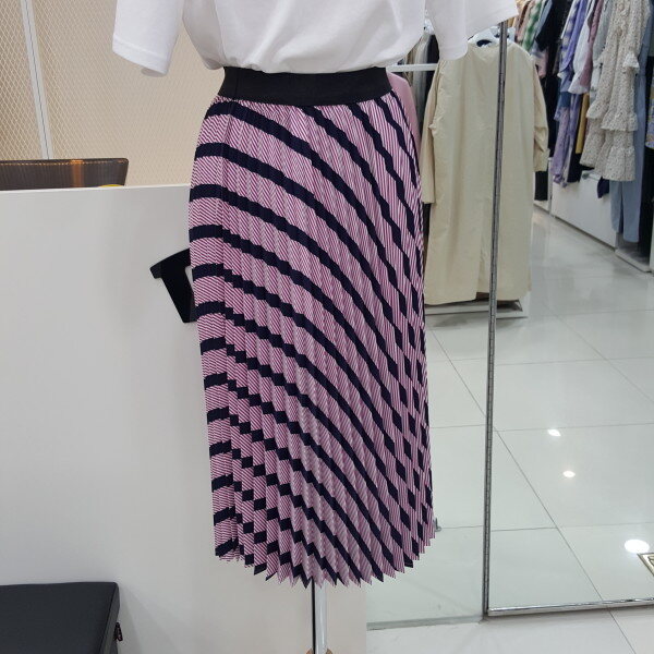 허리밴드로 된 플리츠 스커트입니다 스트라이프 패턴의 배색과 주름모양에 따라 움직이는 찰랑거림이 모던한 분위기 연출을 하는 디자인입니다