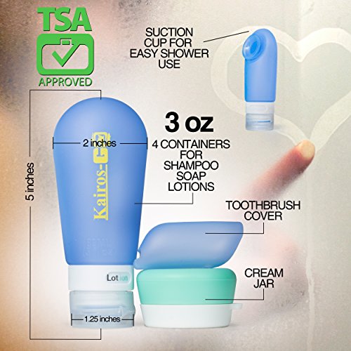 - THE MOST TRUSTWORTHY TRAVEL BOTTLES ARE FINALLYHERE–No need to worry about leaky bottles, since the KAIROS-GO premium silicone bottles feature 3 layers of protection thatwill keep liquids in and your luggage 100% mess-free! Theflexible silicone material, wide mouth and handy lid will make sure thatyour trip is care-free!
