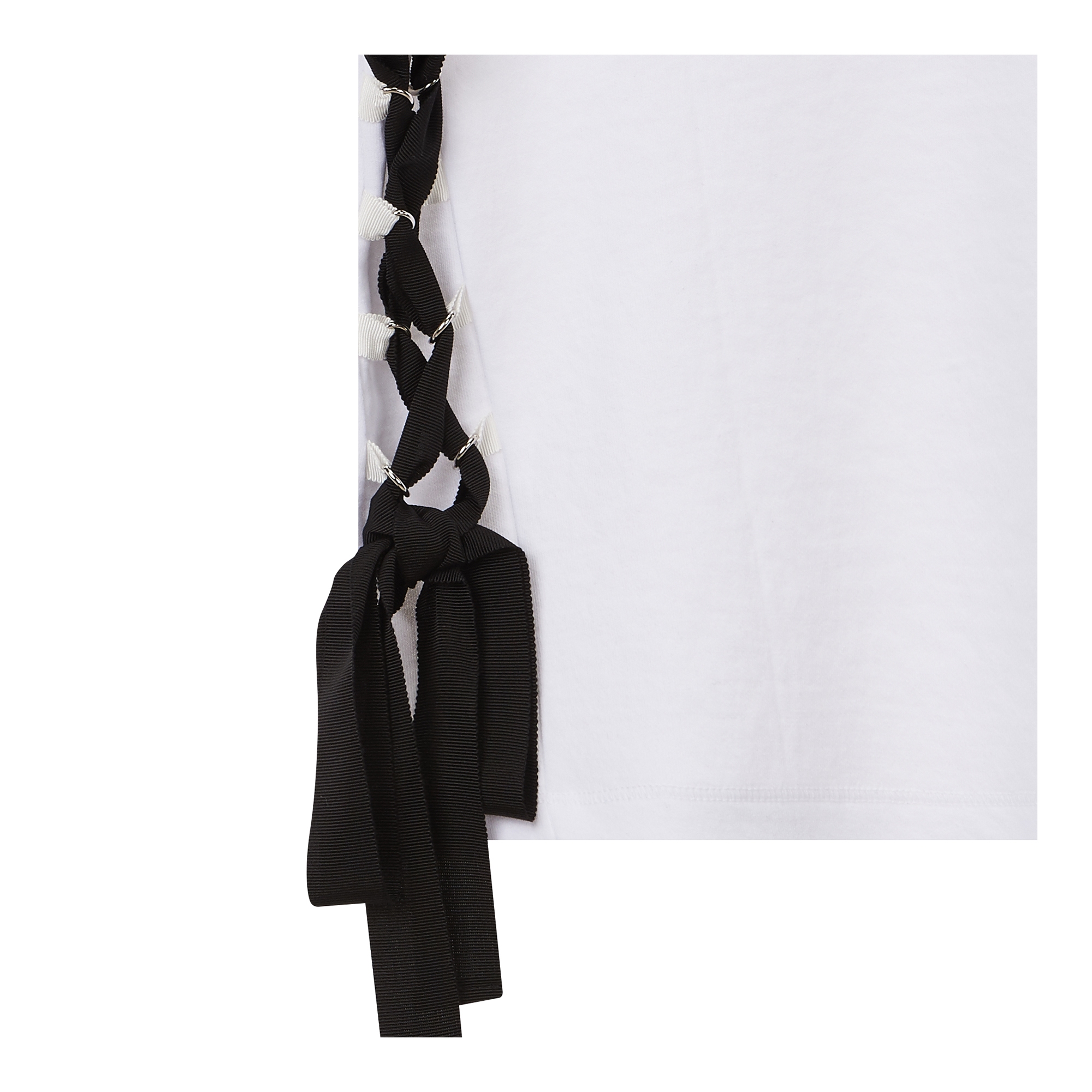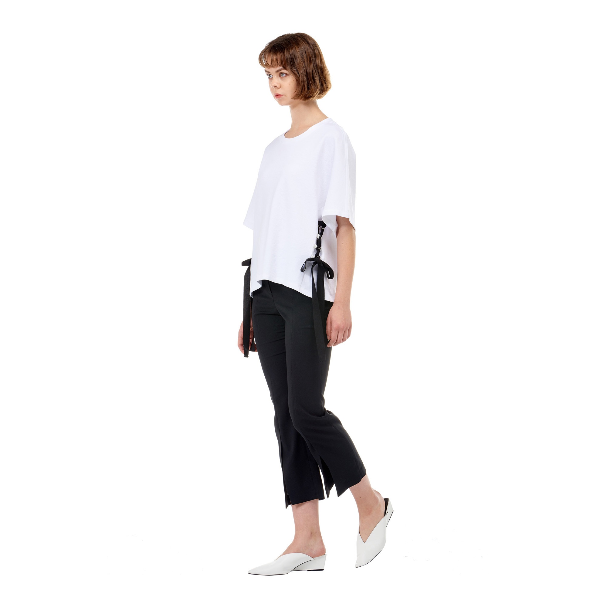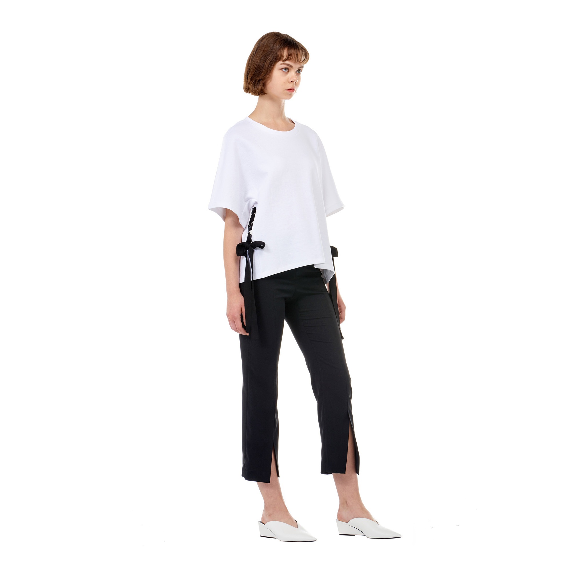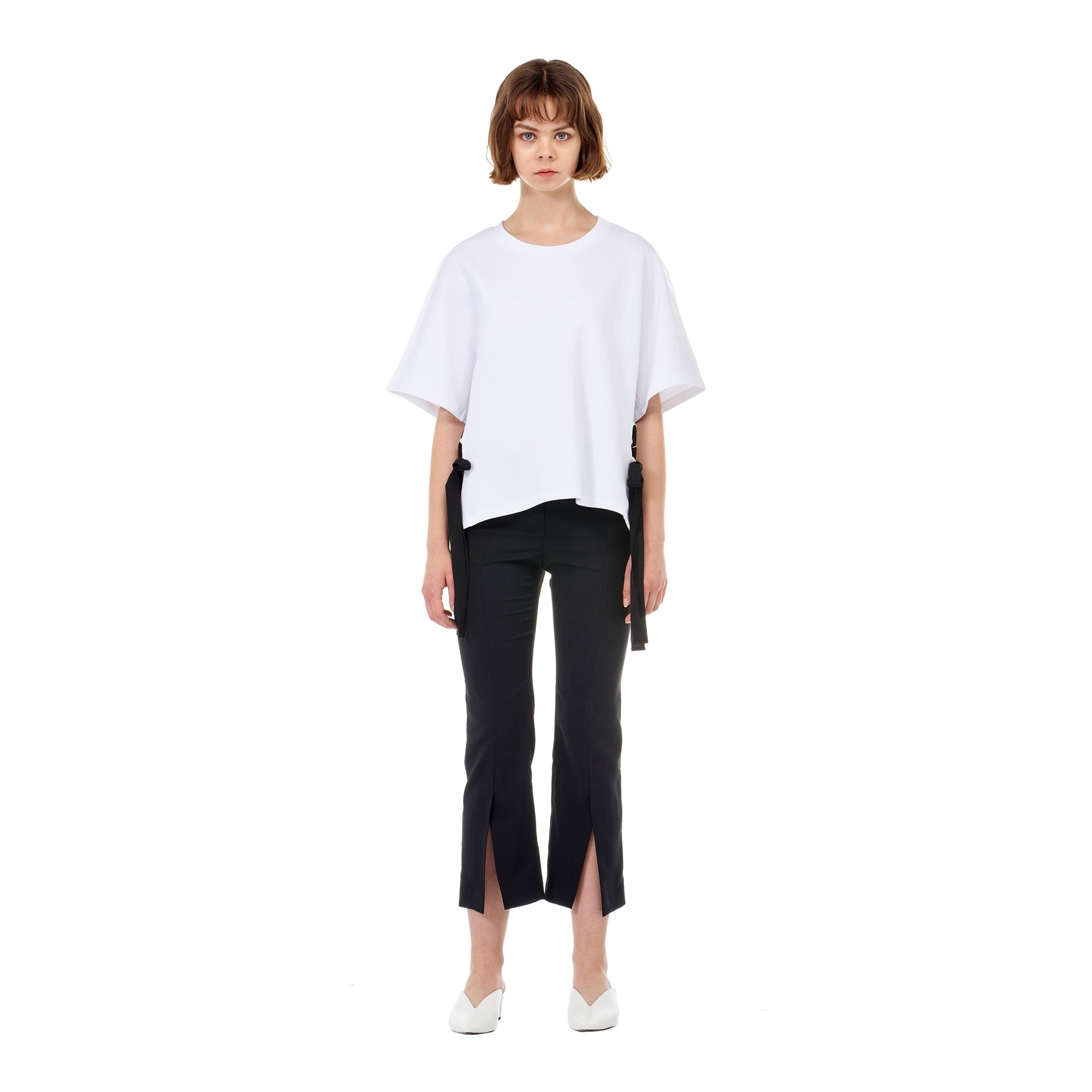 컬렉션 : 2018 Spring/Summer 디자인 포인트 : - 사이드에 스트링 장식 디테일이 돋보이는 유니크한 무드의 티셔츠- 끈 장식 디테일로 다양한 연출이 가능한 디자인- 면 혼방 소재로 가볍고 편안한 착용감을 선사하는 포인트 아이템 스타일링 추천 : 다양한 워싱의 데님팬츠와 스니커즈를 매치하여 캐주얼한 스타일링을 할 수 있음