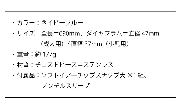 ●サイズ:全長=690mm、ダイヤフラム=直径47mm(成人用)/直径37mm(小児用)