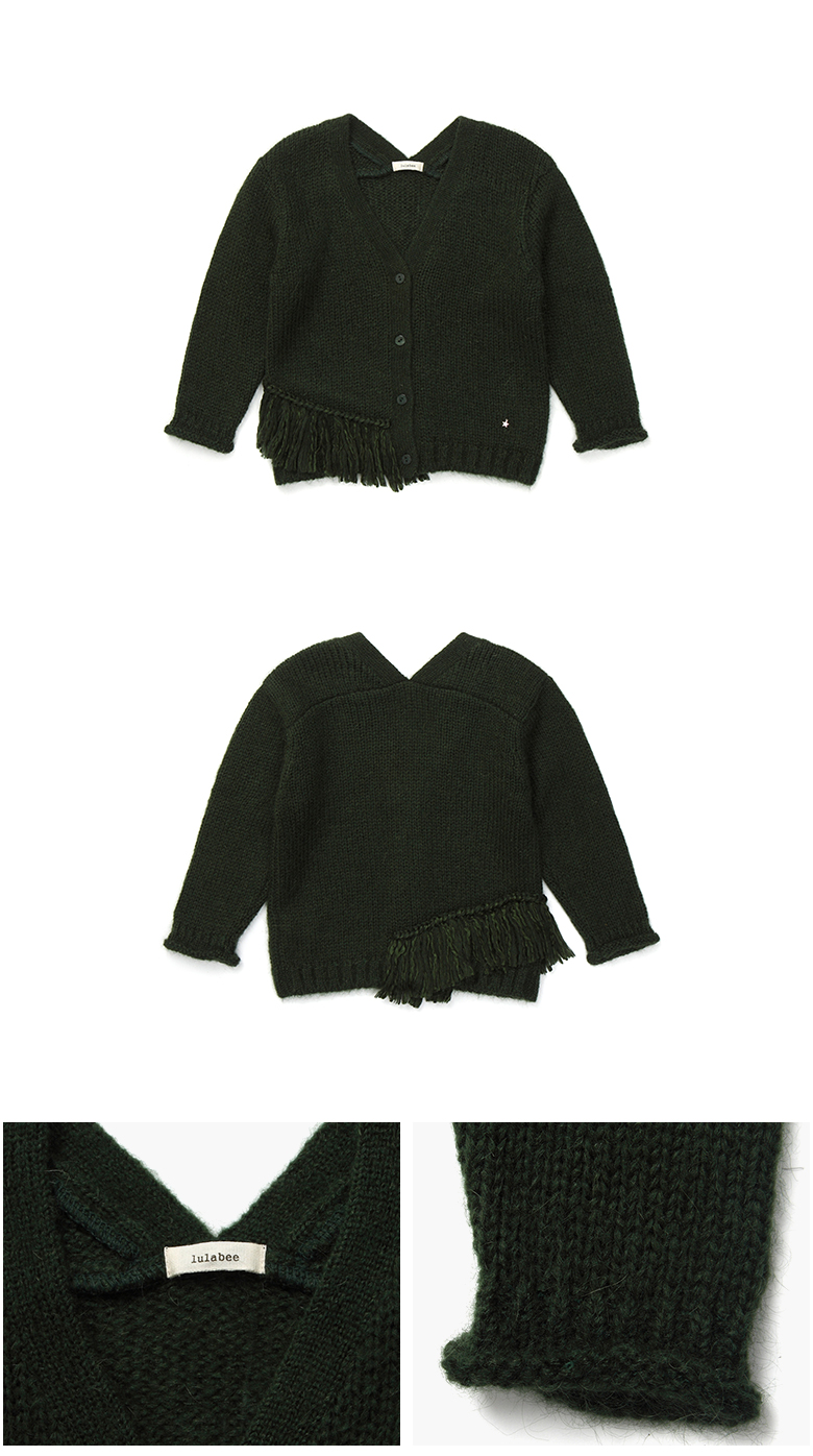 루즈핏으로 세련된 느낌을 주며 밑단 언발란스하게 떨어지는 프린지 장식이 특징입니다.