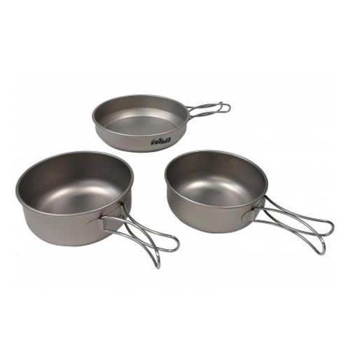 티타늄(티탄)제의 식기3점세트 크기 / 대:H60×137mm 650ml,소:H55×129mm 500ml,뚜껑:H35×148mm 400ml 중량 / 대:88g,소:80g,뚜껑:80g 재질 / 본체:티타늄,도리데:스테인레스 부속품 / 메쉬 케이스