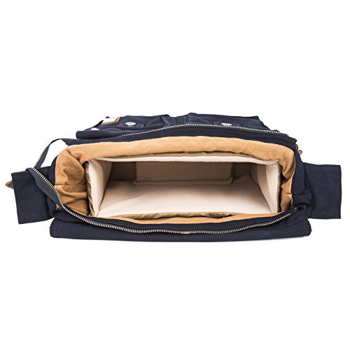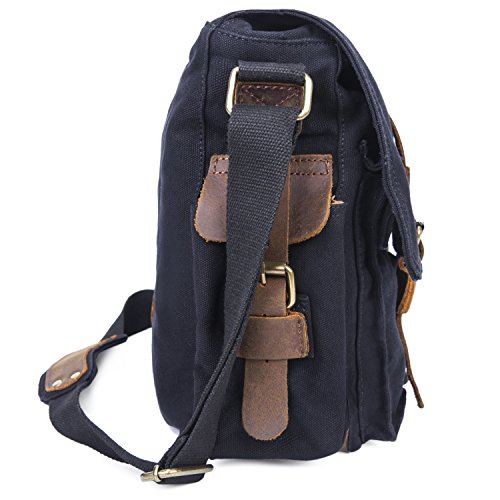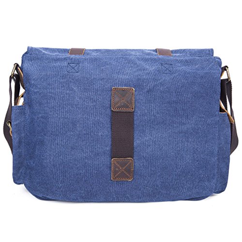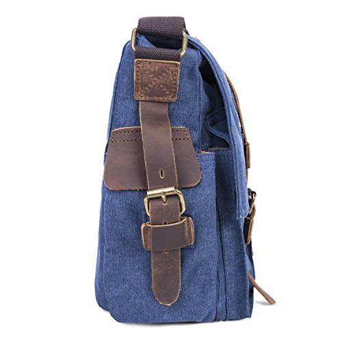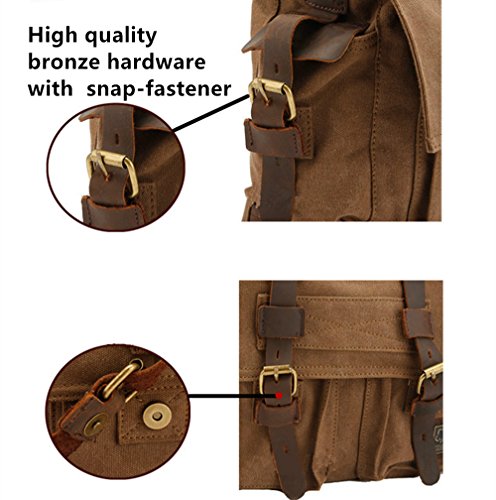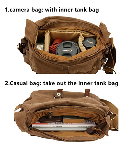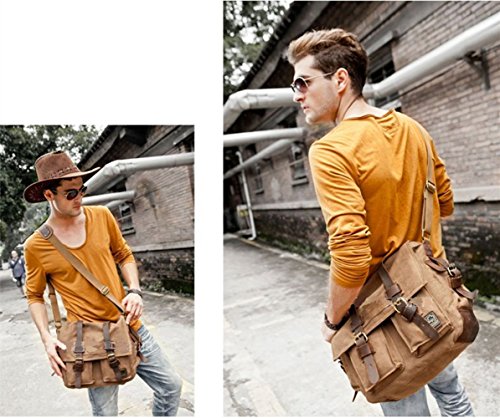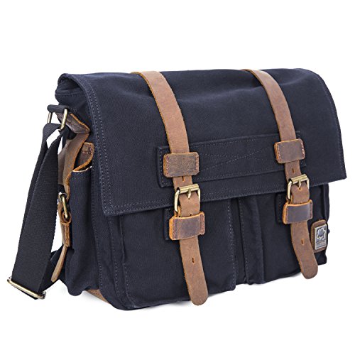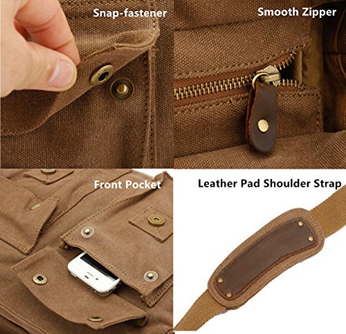 -. Feature : Product Dimensions: 14.17"L x 11.02"H x 3.94"W, suit for 13 Inch laptop. / Superior cowhide crazy horse leather masterfully sewed with durable and red wash canvas fabric to ensure long lasting durability. / Excluding the main storage compartment, featured on the messenger bag are 2 larger Front pockets for easy access of frequently handled items, 1 zipper pocket for significant articles such as wallets and identification documents, and 2 Inner wall pockets to store cellphones, chargers, earbuds, and glasses. / This messenger bag fits for A4 magazine, 13-inch Macbook pro, textbooks, mobile phone and iPad. / The messenger bag features a wide shoulder strap that eliminates shoulder fatigue. The shoulder strap can be easily removed when not required, and effortlessly adjusted to preferred lengths. The bag can be carried by the handle, worn on shoulders, and positioned across body.