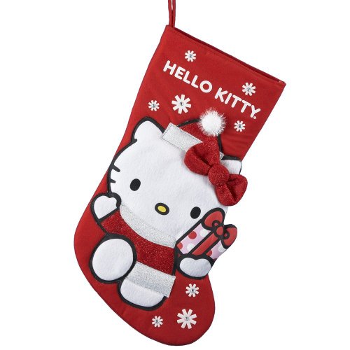This 18.5-inch Hello Kitty applique stocking by Kurt Adler is sure to be a fun and festive addition to your holiday décor. Perfect for fans of the adorable Hello Kitty, its red body features a large applique of Hello Kitty wearing a Santa-style outfit and holding a gift box. White snowflakes and the name Hello Kitty in white complete its festive look.Feature