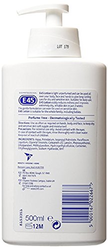 Studio : Grocery Publisher : Grocery Binding : Health and Beauty Product Description E45.. Skin care you can trust. E45 Lotion is light and unperfumed. It can be used all over your body, face and hands to care for sensitive and dry skin. Use this moisturiser every day to help keep your skin soft, supple and moisturised and to prevent it from becoming dry. The gentle, hypoallergenic formulation is easily absorbed and can be used on even sensitive skin. Perfume free, dermatologically tested, allergy screened and non-greasy. 0