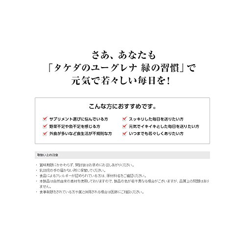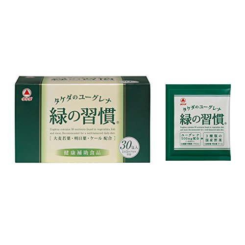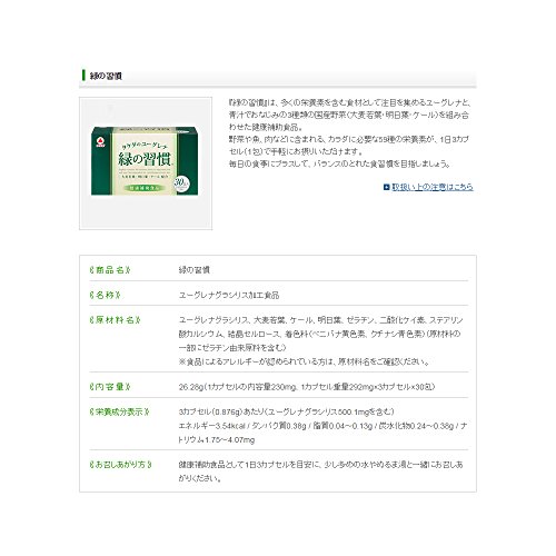 "Green habits" is and Euglena attract attention as a food that contains a lot of nutrients dietary supplement that combines the familiar three types of domestic vegetables (barley young leaves tomorrow leaves kale) in blue juice. Vegetables and fish are included such as in meat 59 kinds of nutrients needed by the body is you can easily take you efficiently in a single day 3 capsules (1 package). Plus the daily diet let's aim to balanced eating habits of balance.