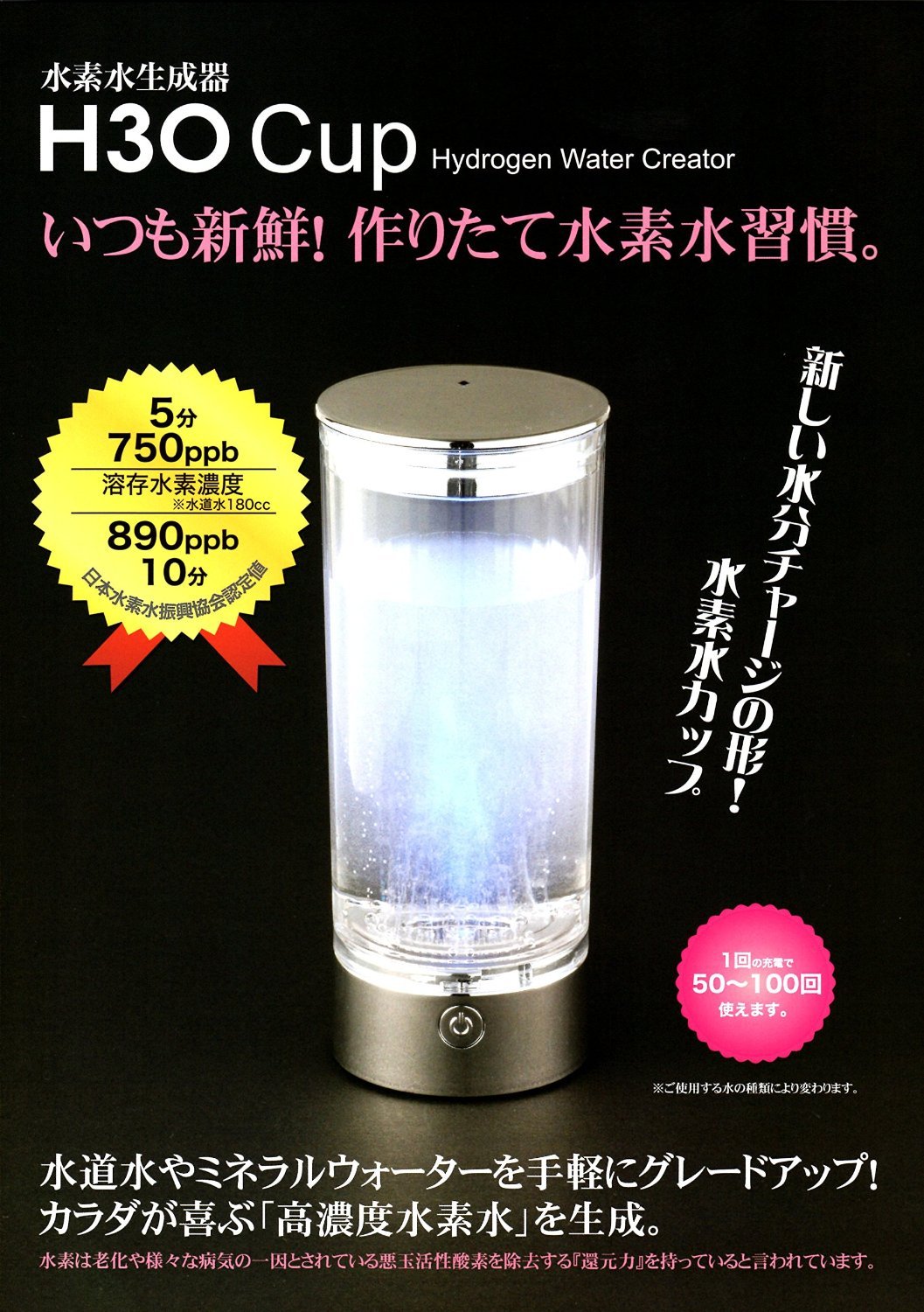 "Hydrogen Water Generator H 3 O Cup" is a hydrogen water production cup that produces hydrogen quickly by direct electrolysis.