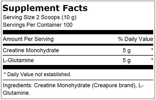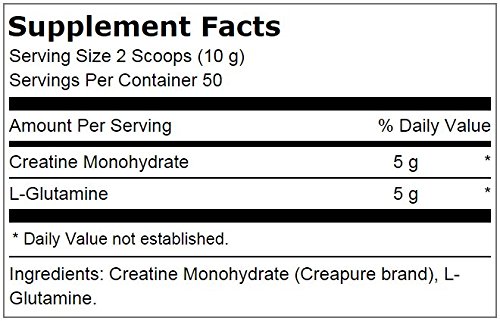 -. Feature : 5 grams of high quality, pure German Creatine Monohydrate / 5 grams of USP grade, pure L-glutamine / No fillers or additives / May help athletes work out at a higher intensity during resistance exercise / May promote gains in power, strength, muscle size and lean muscle