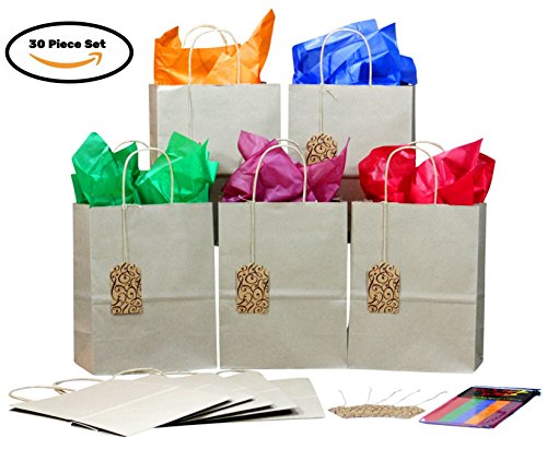 BagLove 30pc set DIY Gift Bags (Brown Kraft Bags with Colorful Tissue Paper and Gift Tags) Recycled, Biodegradable, Perfect for Birthdays, Holidays, Kids Craft...