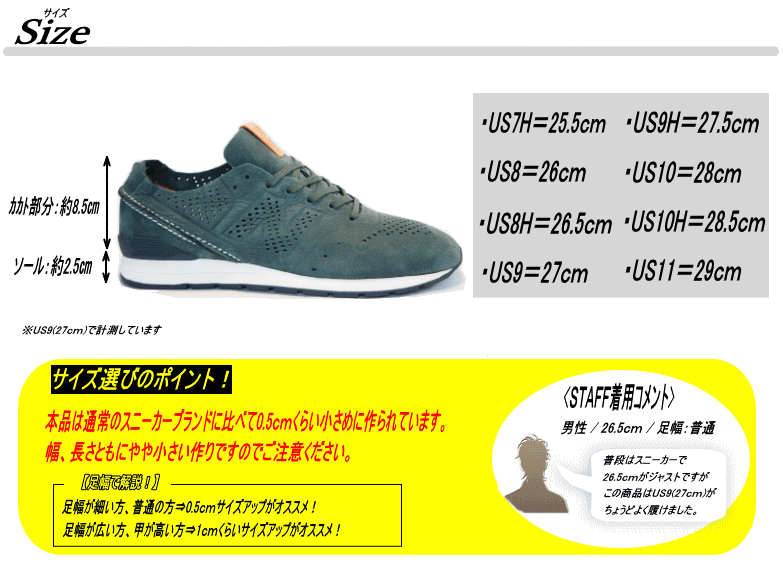 | サイズ | 作り⇒やや小さめ 【サイズ選びのポイント!】 足幅が細い方、普通の方⇒0.5cmくらいサイズアップがオススメ! 足幅が広い方、甲が高い方⇒1.0cmくらいサイズアップがオススメ! |