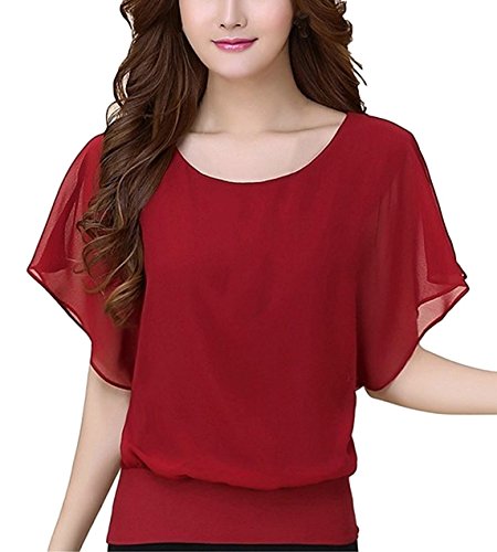 -. Feature : 今季トレンドの軽やかなとろみ シフォン ブラウス です。ふわっと上品な広がりのあるシルエットにフレア スリーブがアクセントになったとてもお洒落で旬な1枚。丸襟デザインがデコルテを綺麗に見せてくれて、セクシーな大人感も漂わせるフェミニンなレディーストップスです。春夏に活躍するハーフスリーブは気になる二の腕をすっぽりカバーして華奢見せしてくれます。さらりと着れるボックスシルエットは体型カバー効果もあり、ママコーデにも大活躍です。 / 肌ざわりのよい伸縮性のある生地が着心地よく、爽やかで清潔感のあるブラウスなので、女性らしいエレガントな雰囲気を醸し出し、清楚なきちんとコーディネートにも最適。カジュアルにもシックにも、取り入れるだけでオンナ度が上がるゆったり便利ブラウス。カジュアルなデイリーユースにも、ビジネス、オフィス、通勤、通学、デートにも。フォーマルやオケージョン(パーティ、結婚式、二次会、お呼ばれ、入学式、入園式、卒業式、卒園式、発表会、演奏会、七五三等)にも。 / 肩落ちしたナチュラルな雰囲気のシンプルで大人可愛いデザイン。ボトムにINしても、そのままさらりと着ても◎ スカートでもデニムでもOKで、ボトムスを選ばないのも嬉しいオシャレアイテム。デニム、ワイドパンツ(ガウチョパンツやスカーチョ)との楽ちんコーデや、キチンと感のあるタイトなボトムスと、ブーツやヒール、パンプスなどのシューズを合わせれば、ぴりっと辛口にまとまった、大人のカジュアルコーディネートが完成。 / 毎日着ても飽きのこない無地でシンプルな定番デザイン。カラーは人気のホワイト、ブラック、ブルー、ワインレッド、パープルの5色をご用意しています。春、夏はインナー(キャミソール、タンクトップ)の上に羽織って、袖を軽くロールアップしても。秋、冬にはやアウター(セーター チェスター トレンチ ダウン コート ジャケット)やファッション小物(ストール マフラー スヌード)などを合わせてコーデを楽しんでくださいね。 / 年齢問わず(20代、30代、40代、50代)季節問わず(春、夏、秋、冬)オールシーズン活躍すること間違いなしの便利アイテムです。 【カラー】ホワイト(白)、ブラック(黒)、ブルー(青)、レッド(赤)、パープル(紫)【サイズ 】S、M、L 、XL【素材】シフォン(ポリエステル)、裏地:なし、付属品:なし   ※サイズ(寸法)をお確かめの上、ご購入ください。