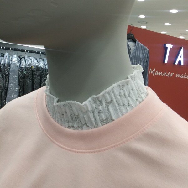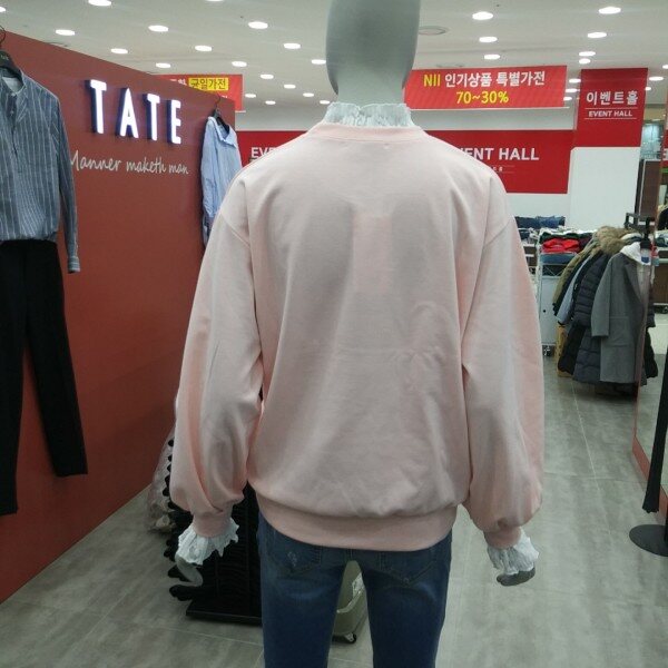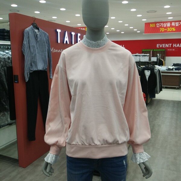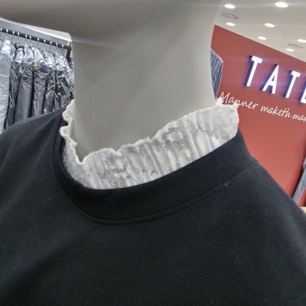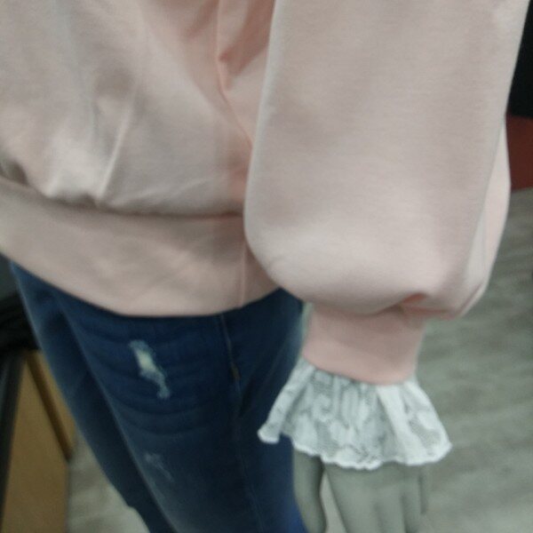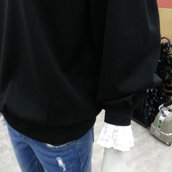넥라인과 소매가 레이스로 레이어드 된 티셔츠입니다. 오버핏이며 팔부분도 넓었다 시보리에서 좁아져 샤링이 살짝잡히는 디자인입니다원단소재도 부드럽고 적당한 얇기로봄에 러블리하게 코디하기 좋습니다.