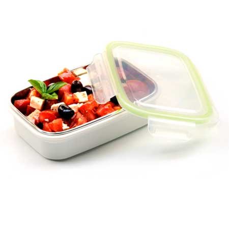Container Features: Capacity: 560 ml - 20 ounces. Dimensions: 184 x 127 x 55 mm (7.25 x 5.0 x 2.2 inches). Color: White with green silicone seal. Reusable, durable and leak-proof. Interior Material: Food grade #304 stainless steel. Outside Material: Durable polypropylene (#5) shell. Silicon seal prevents leaks. Easy clip on see-through lid. Freezer and top rack dishwasher safe. BPA and Phthalate free. Not suitable for use in microwaves or ovens.