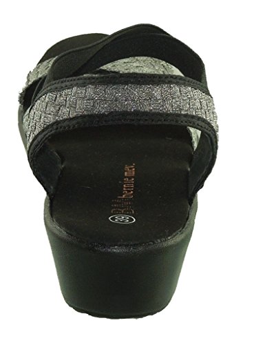 Product Description Women's Bernie Mev, Lisa Low Heel fabric Sandals An all day sandal that?ll bring you comfort! Fabric upper Ankle strap with elastic goring for an easy on and off Leather topped cushioned footbed for added comfort 1 1/2 inch heel Textured manmade outsole. Heel Height of 1.50 inches 0