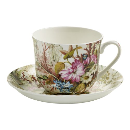 -. Feature : Frühstückstasse mit Untertasse, dekoriert, Dekor: Ocean Fantasy / florales Dekor mit edlem Glanz / Original-Motiv des britischen Textil-Designers William Kilburn / Material: Bone China (edles, hochwertiges Porzellan mit feinem Glanz) / spülmaschinengeeignet, ofenfest, mikrowellenfest, gefrierschranktauglich / in attraktiver Geschenkbox verpackt / Länge: 17,5 cm, Breite: 17,5 cm, Höhe: 9 cm, Durchmesser: 17,5 cm, Füllvolumen: 460 ml, Gewicht: 450 g